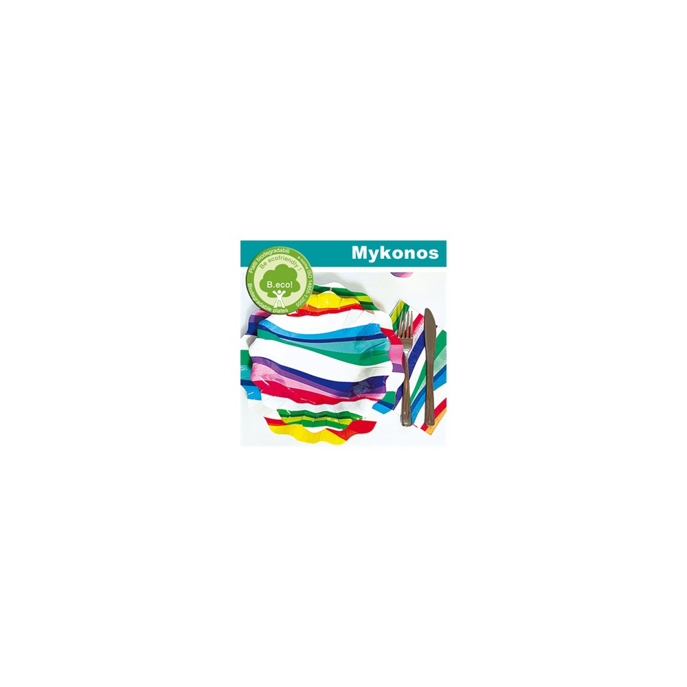 Piattini piccoli per antipasti, dolce e frutta modello Mykonos in cartoncino plastificato colorato. Adatto anche per alimenti caldi. Confezione da 10 pezzi.